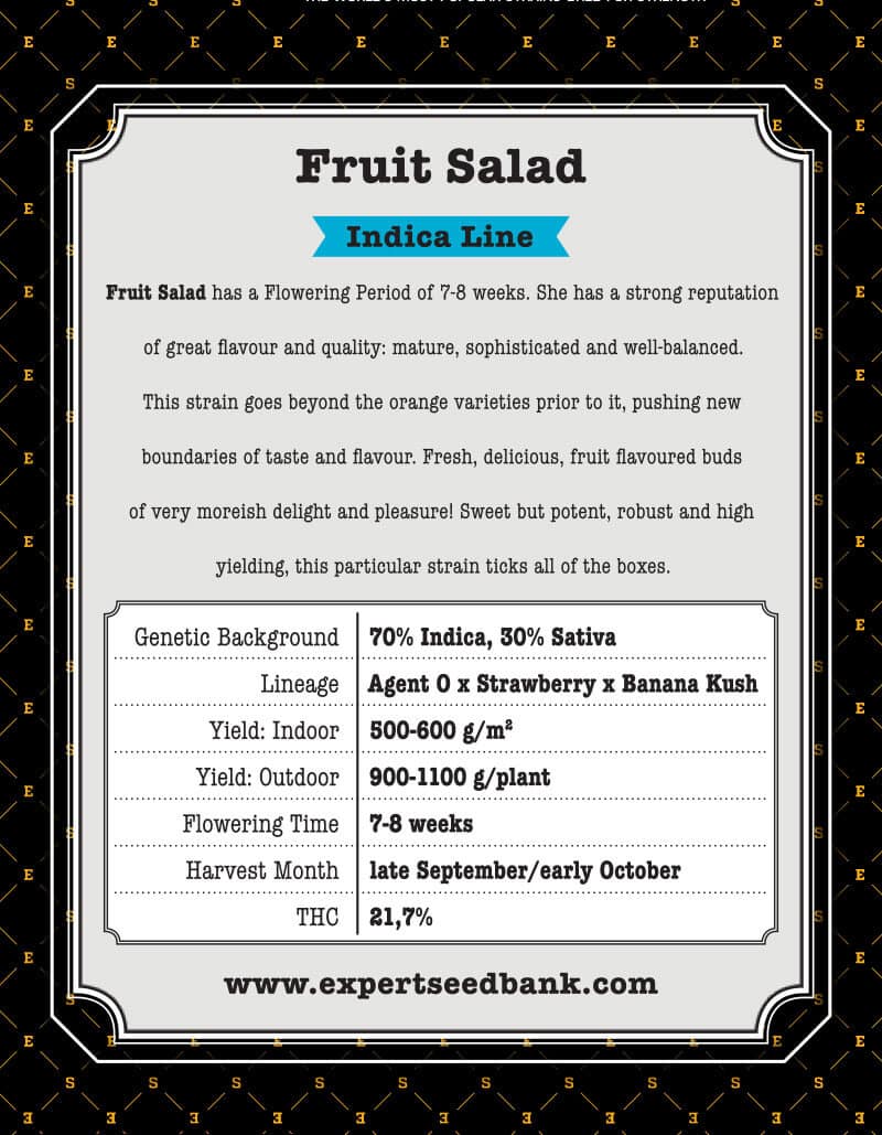 The Fruit Salad hybrid is potent and grows in the classic indica style. You can anticipate big leaves, quick bud development, and sticky flowers. After only 7–8 weeks of flowering, up to 600g/m2 can be gathered from indoor grows. It is also possible to harvest up to 1 kg per plant outside in the fall.